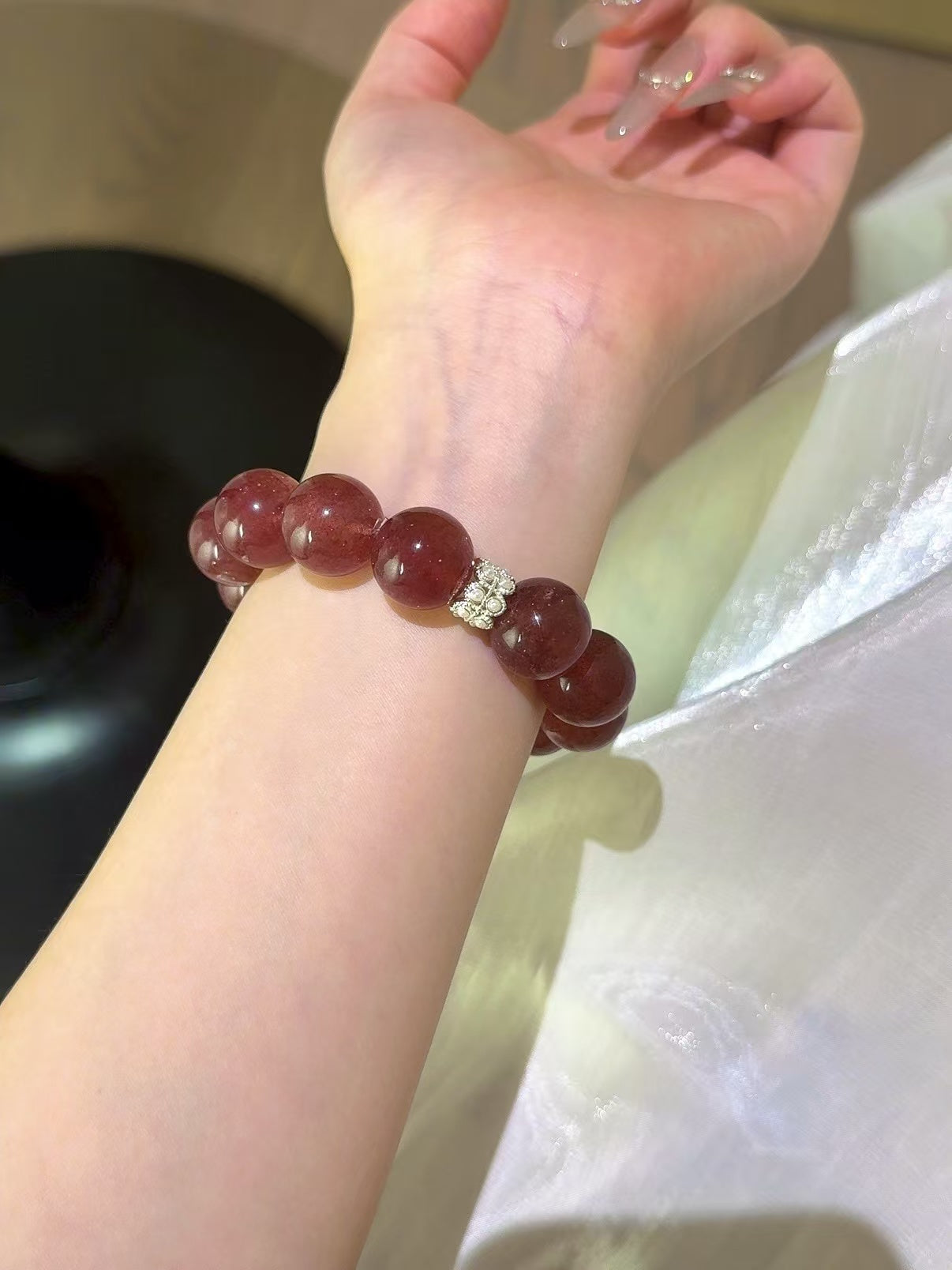 Interspersed among the Strawberry Quartz beads is a delicate diamond - encrusted accent, adding a touch of elegance and luxury. The diamonds not only enhance the visual allure of the bracelet but also symbolize eternity and purity in Western culture, while in Chinese traditions, they represent strength and protection.