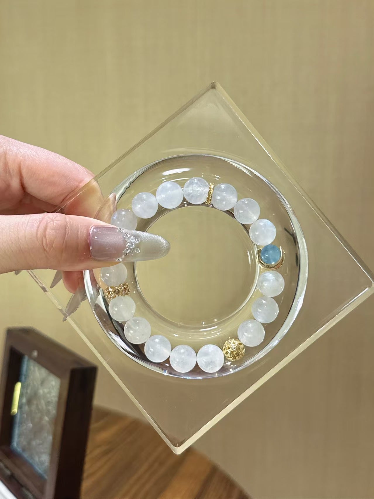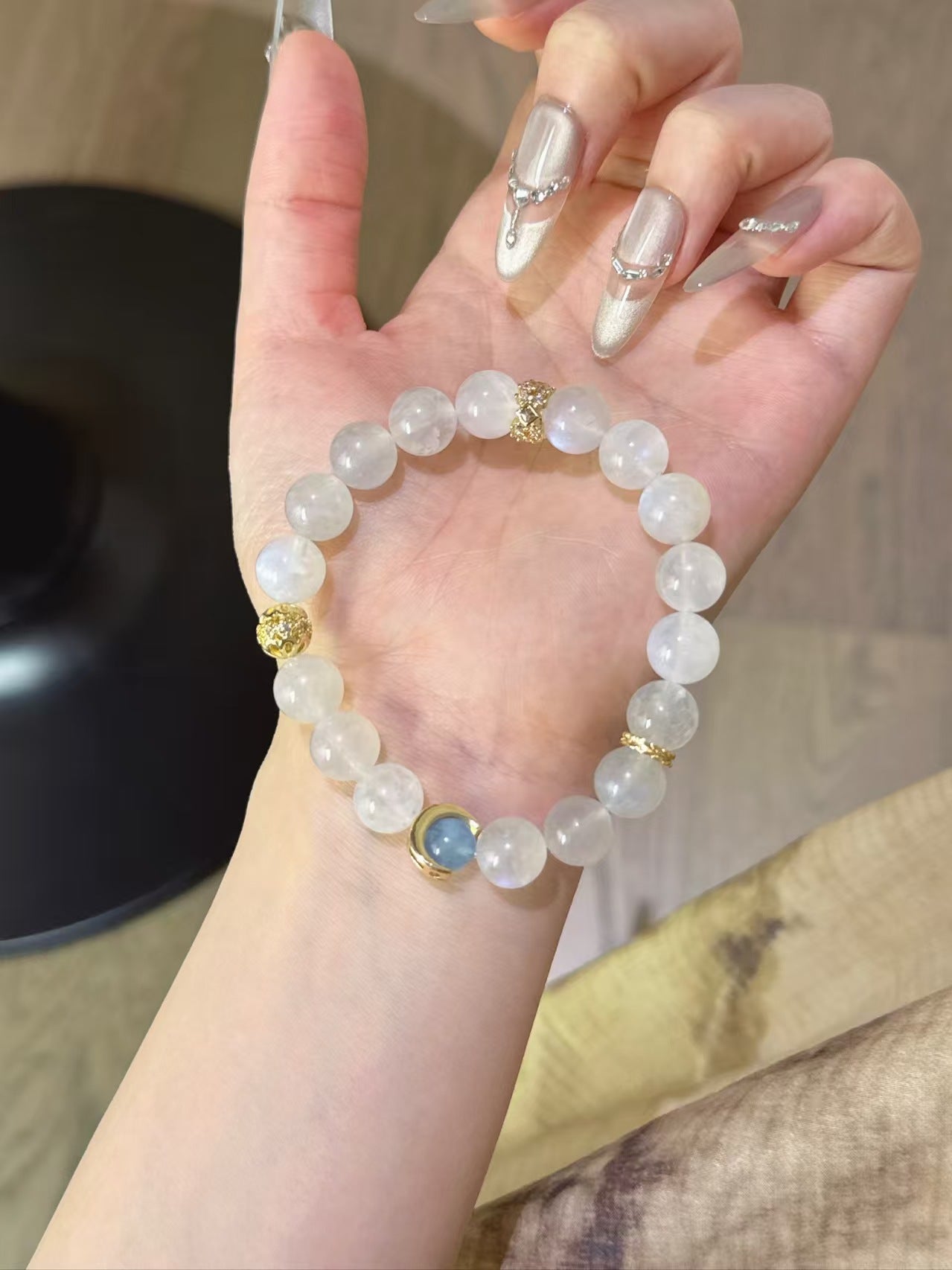 Complementing the Blue Moonstone is the 7.5mm Aquamarine bead, adorned in a delicate crescent - moon setting. Aquamarine, with its serene blue hue reminiscent of the ocean, is associated with tranquility, courage, and clear communication. In Chinese culture, water - related elements often symbolize fluidity and the ebb and flow of life, and Aquamarine embodies these qualities perfectly. It is said to wash away stress and negative energy, leaving the wearer feeling refreshed and at peace.