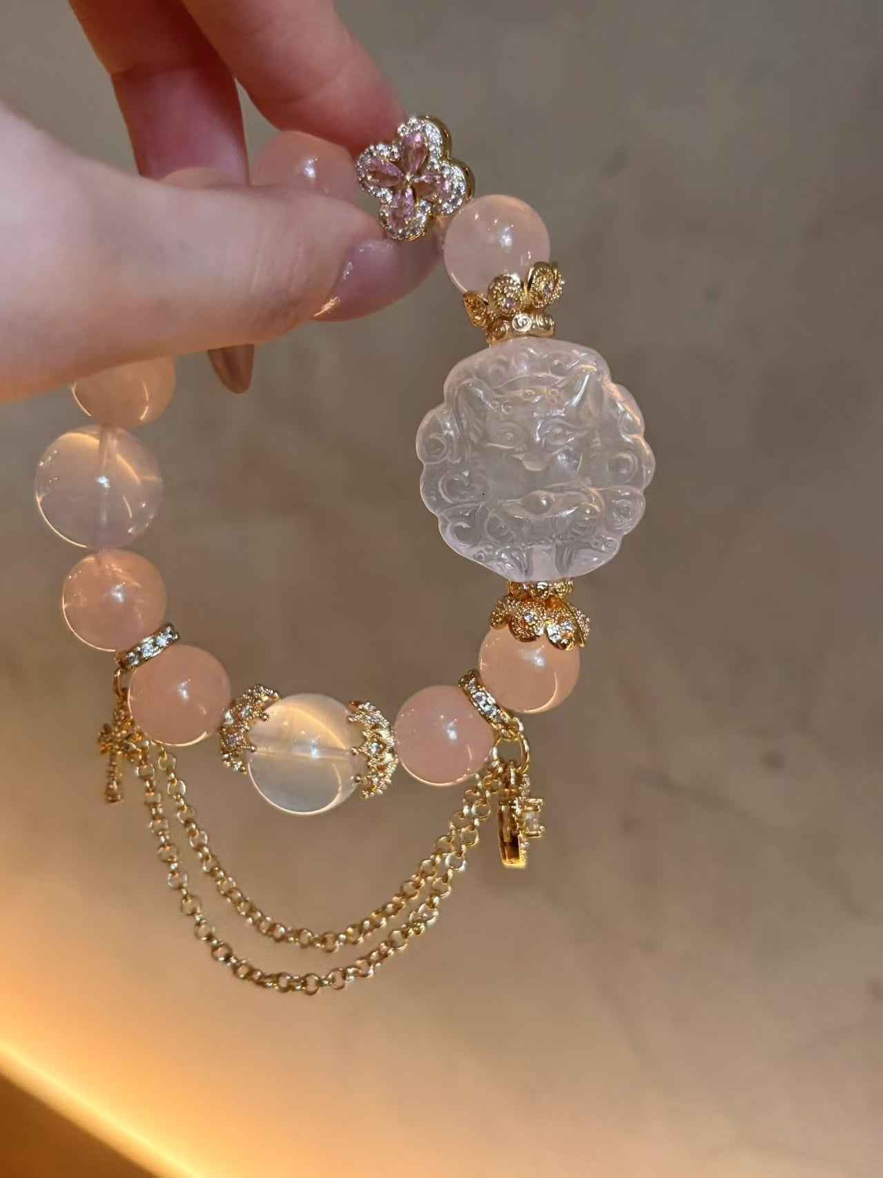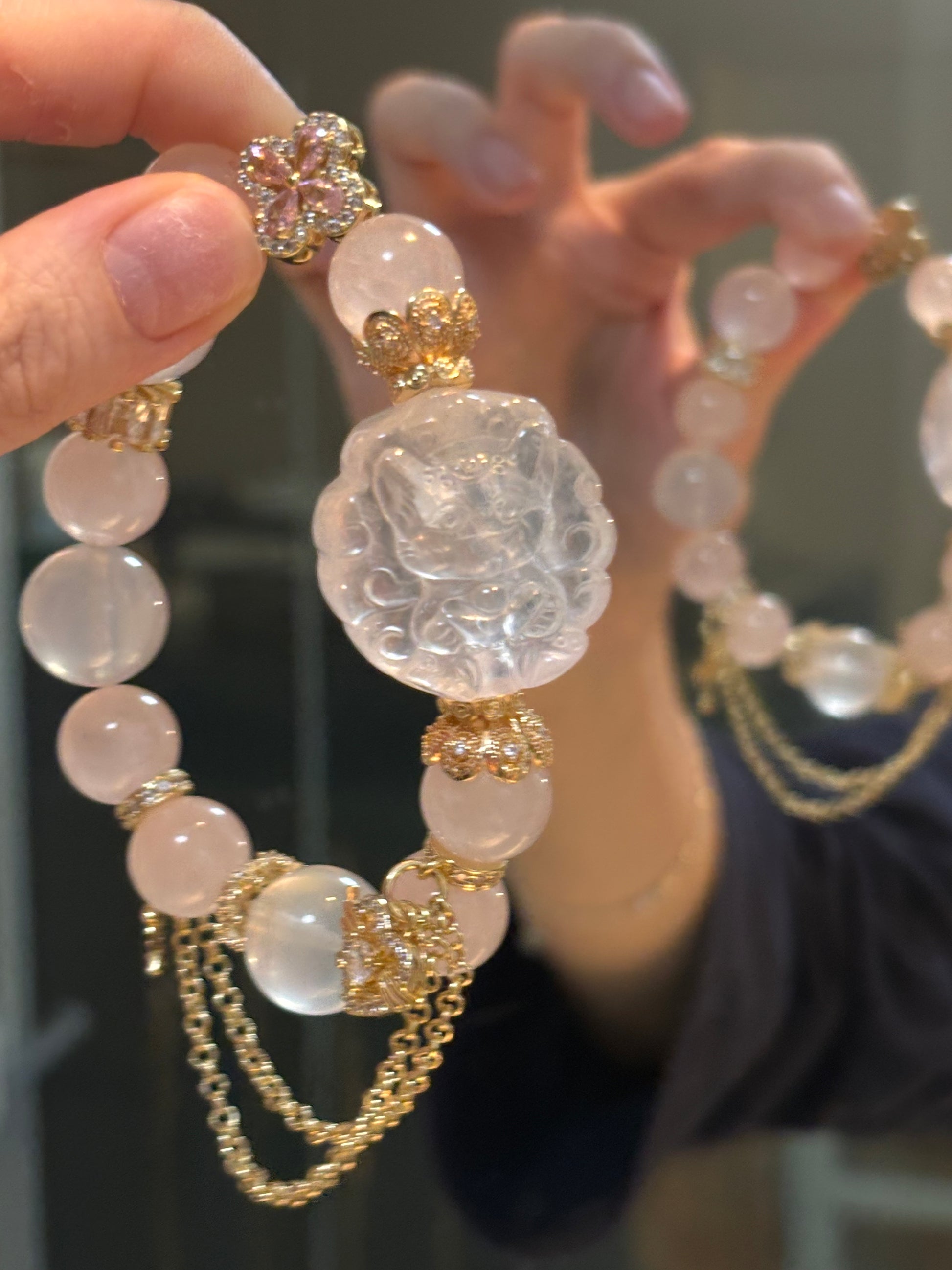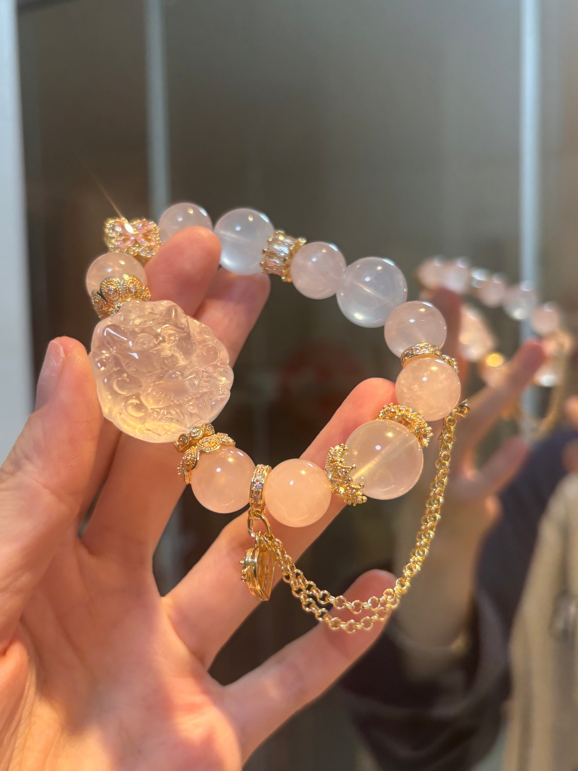 This rose - quartz bracelet, adorned with delicate gold - tone accessories and a carved charm, is a wonderful piece for those seeking love luck, even for foreigners.