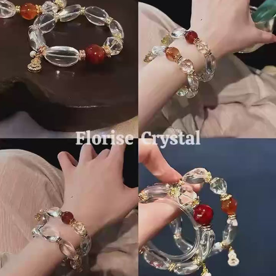 This bracelet features white crystals and red rubber flowers, integrating natural magic and healing power.